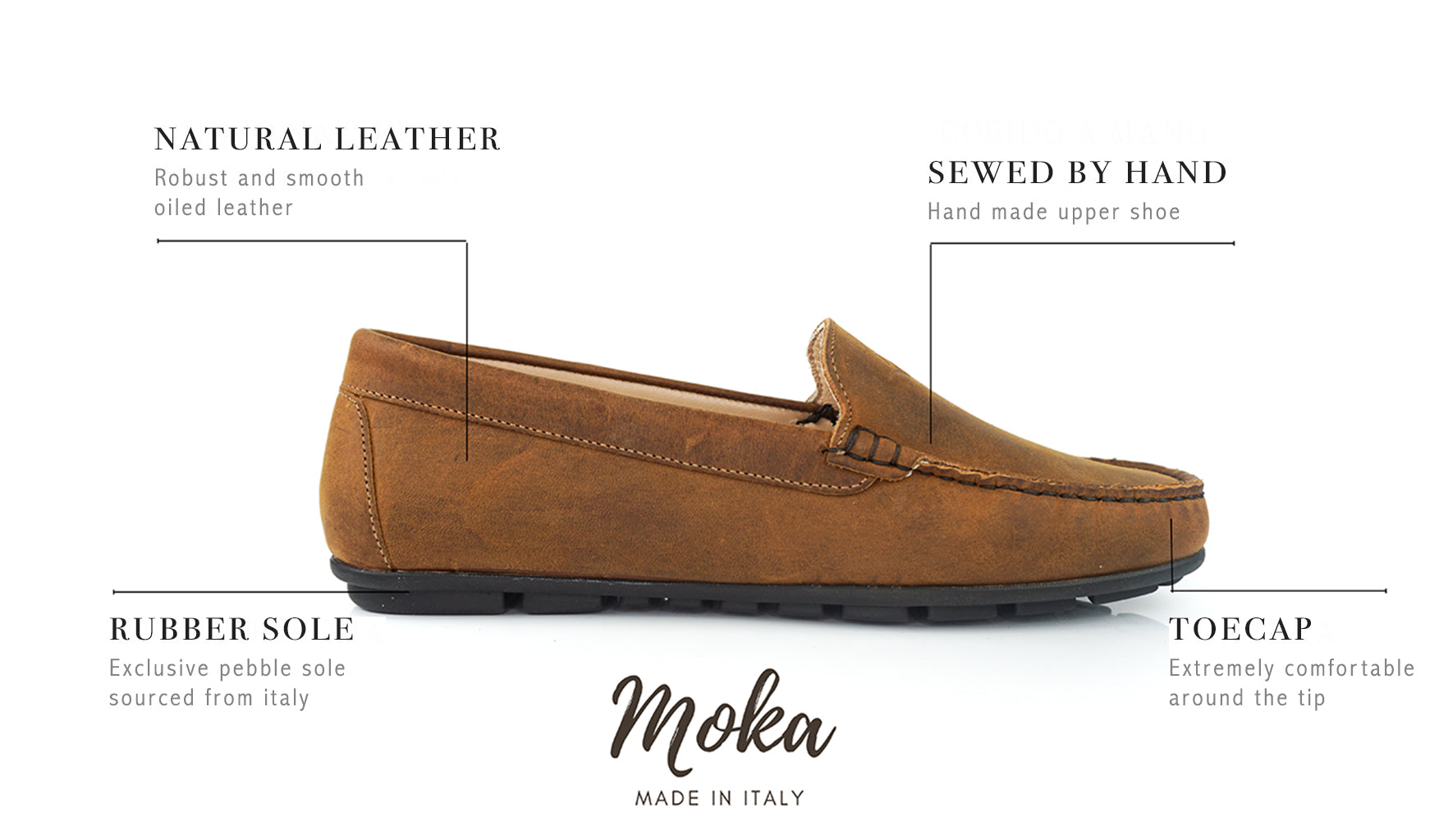 Il Moka ingrassato: Per la collezione Moka, Otello ha selezionato una pelle di alta qualità. Ogni paia di Moka è unico: variazioni di colore, piccoli segni e venature sono caratteristiche naturali e non dovrebbero essere considerate imperfezioni.